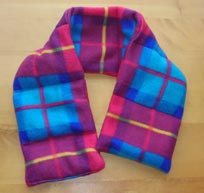 Cut a 6" piece of 60" fleece fabric. Fold with right sides together. Sew 2 edges making a 30" tube using 1/2" side seams, leave one end open. Turn right side out. Pour 2/3 cup of rice into the tube, sew across tube 5" from bottom, trapping rice in first block. Pour another 3/4 cup of rice into tube and sew again 5" above first block. Continue making 6 blocks. Turn edges of top down and sew across to finish last block.